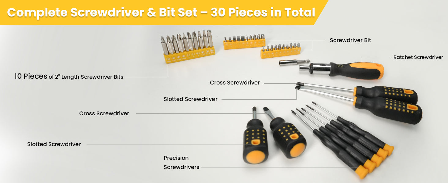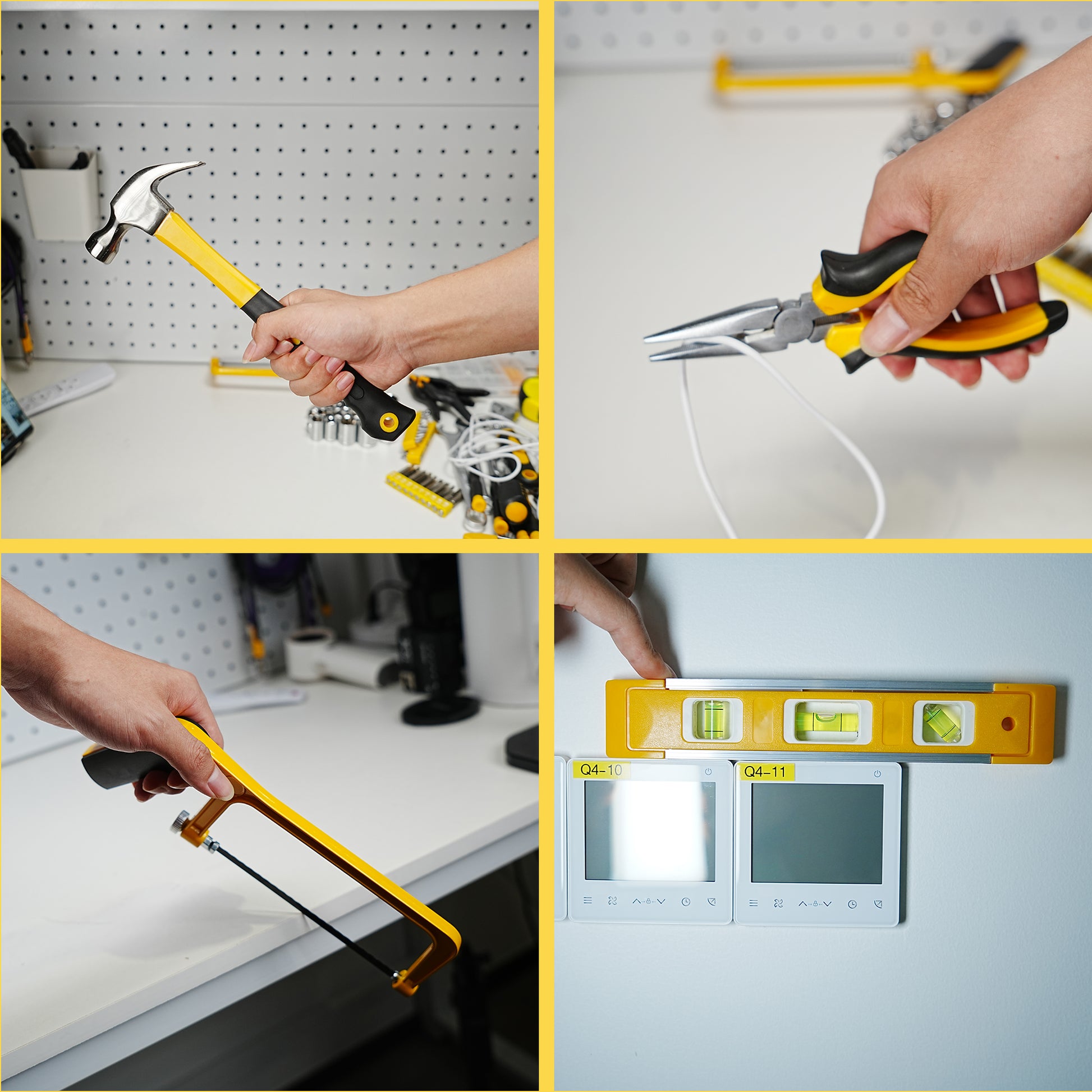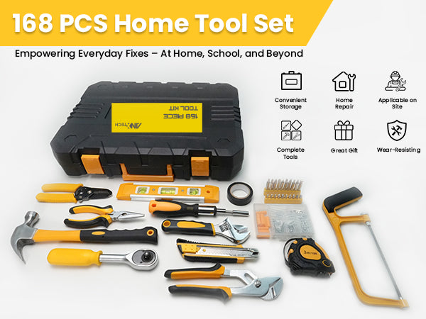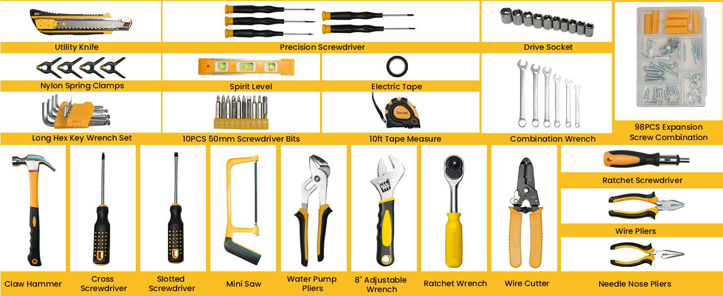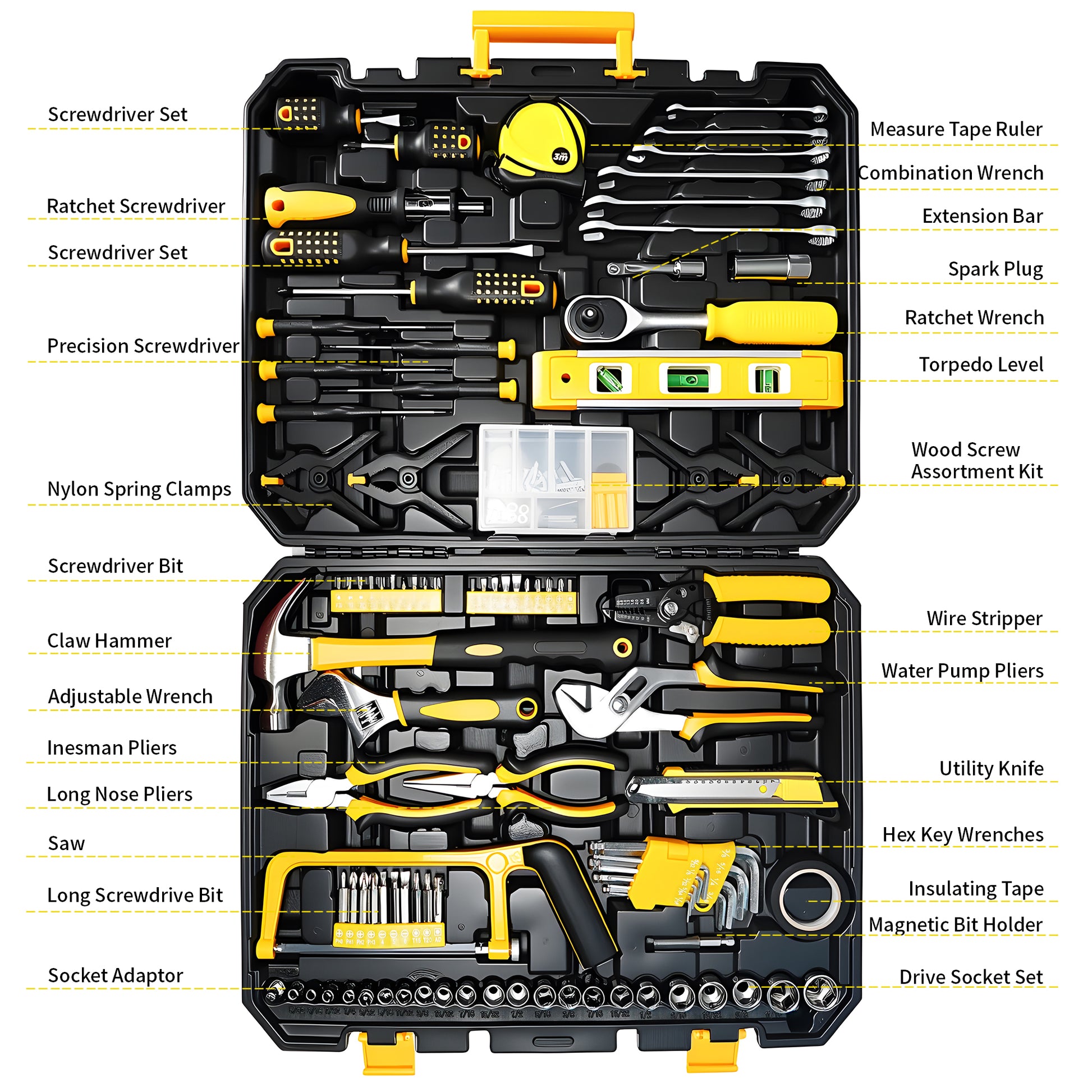 - Comprehensive Home & DIY Tool Kit-This all-in-one tool set includes screwdrivers, bits, ratchet wrenches, socket wrench sets, hand saw, hammer, pliers, tape measure, spirit level, and more. Perfect as a home tool kit, tool kit for dorms, apartments, or small workshop. Ideal for furniture assembly, appliance repair, woodworking, plumbing & electrical maintenance, or car and motorcycle repair.