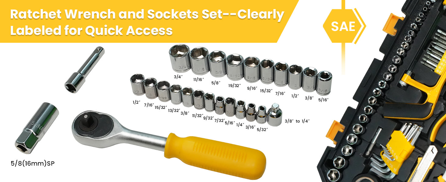 - Wide Range of Sockets, Wrenches -22 sizes of 1/4" and 3/8" drive sockets and 6 sizes of wrenches, allowing assembly and disassembly of furniture, appliances, cars, motorcycles, bicycles, and machinery fixed with nuts and bolts. The 16mm spark plug socket is specially included for automotive maintenance.