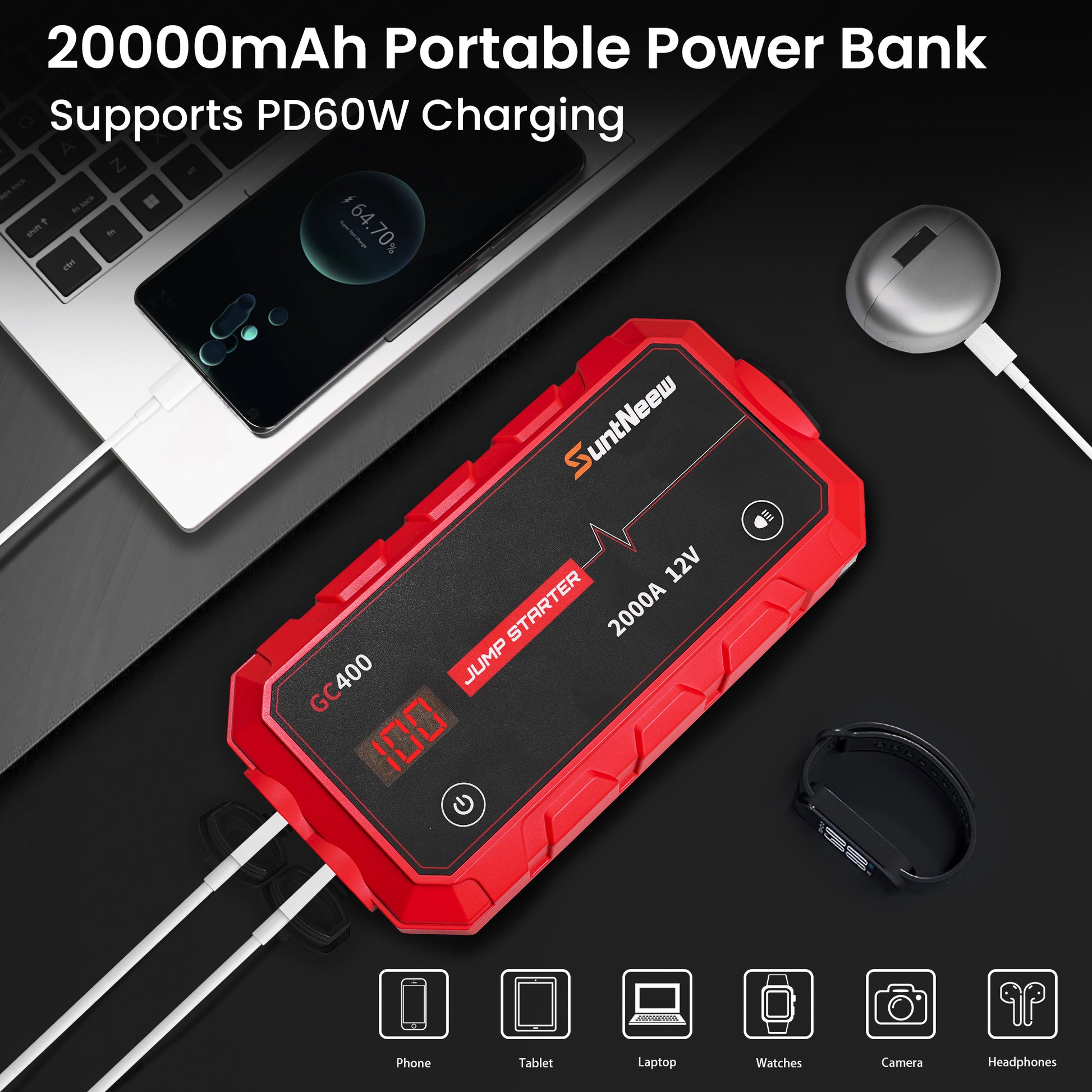 20000mAh Car Jump Starter, 1000A Start / 2000A Peak, 12V Portable Battery Booster with Smart EC5 Clamps, LED Display, PD 18W USB Fast Charging, EVA Case